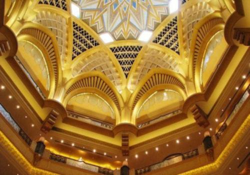 阿布扎比著名的八星級酒店,40噸黃金打造,酋長宮殿酒店位于阿布扎比海灘,北面和西面臨海。設計這座酒店的是英國設計師約翰-艾利奧特,他曾為蘇丹和 文萊的王宮貴族設計過宮殿。酒店最初是為迎接海灣合作委員會首腦會議在阿布扎比召開而修建的,后改為豪華酒店。宮殿酒店提供給人們實實在在享受的高科技?!∪藗冊诰频辏保埃肮晠^(qū)域內的任何一處,都可以享受到無線上網(wǎng)的樂趣,即使是在游泳池邊和私人沙灘上。酒店建筑群的穹頂全部由馬賽克砌成,其中最大的穹頂 直徑達42米,表面鍍銀,并在頂端裝飾了黃金,閃耀著阿拉伯文明獨有的富麗堂皇。