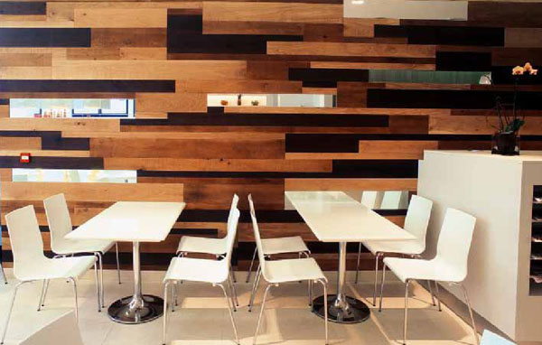 兩側(cè)的墻壁設(shè)計各具特色:邊墻壁是由三種色調(diào)的實(shí)木穿插搭配組成,同時嵌有條形鏡子另一側(cè)7米長的墻壁以淺黃色為背景,前面設(shè)有道亮鉻色珠簾。