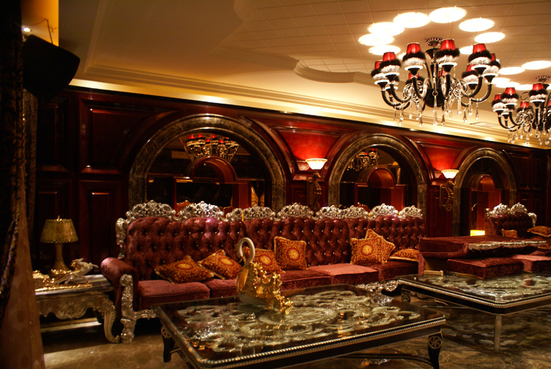 環(huán)球一號國際會所設計,采用歐式風格,大堂設計十分豪華,吊頂設計如同華蓋一般,羅馬柱支撐著華蓋般的吊頂,奢華風貌盡收眼底。